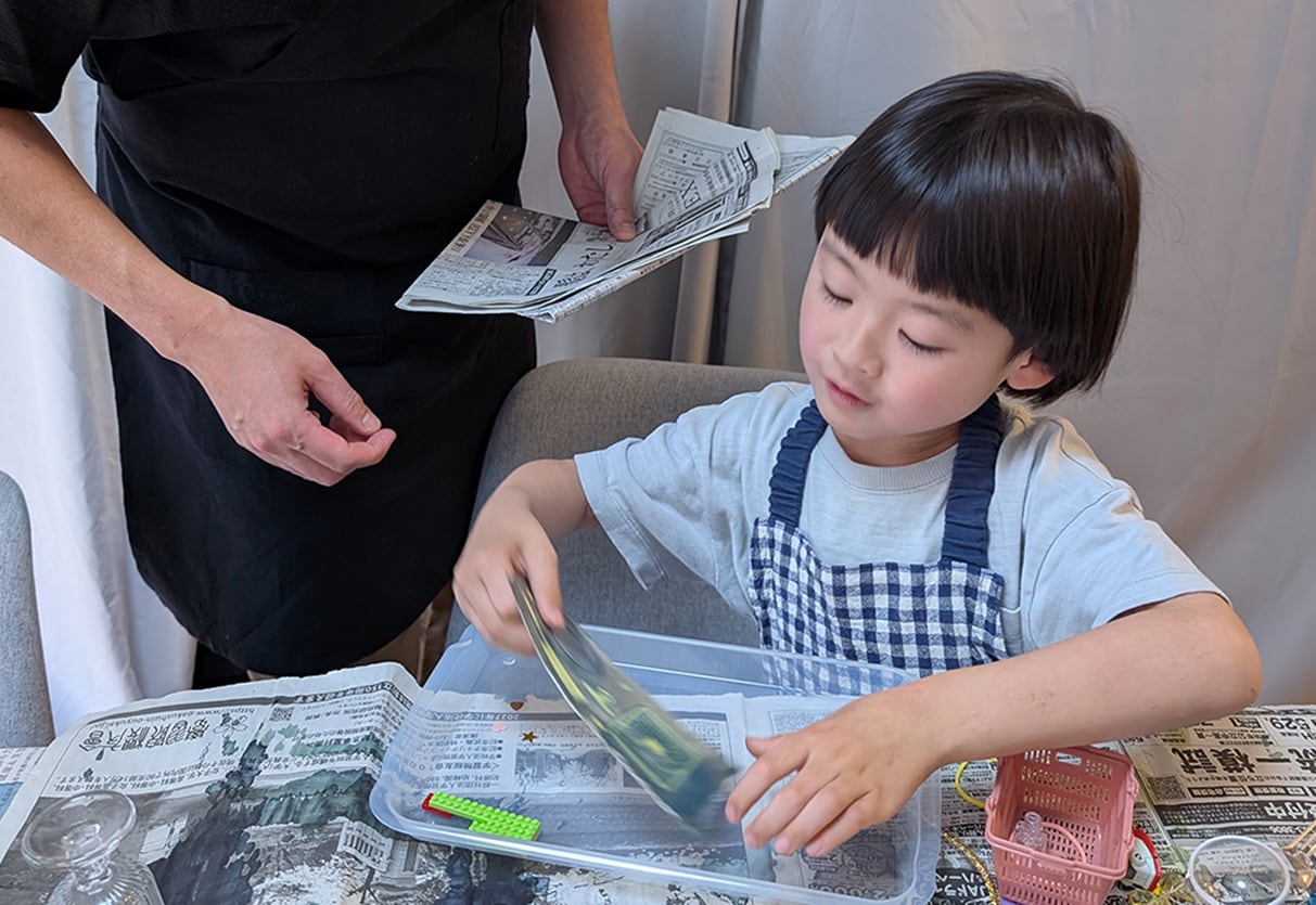 薬品の調合から始まるワークショップはまるで化学の実験のよう。そして、植物や身の回りのものを好きなように並べてデザインし、世界に一枚だけの青写真の出来上がり。